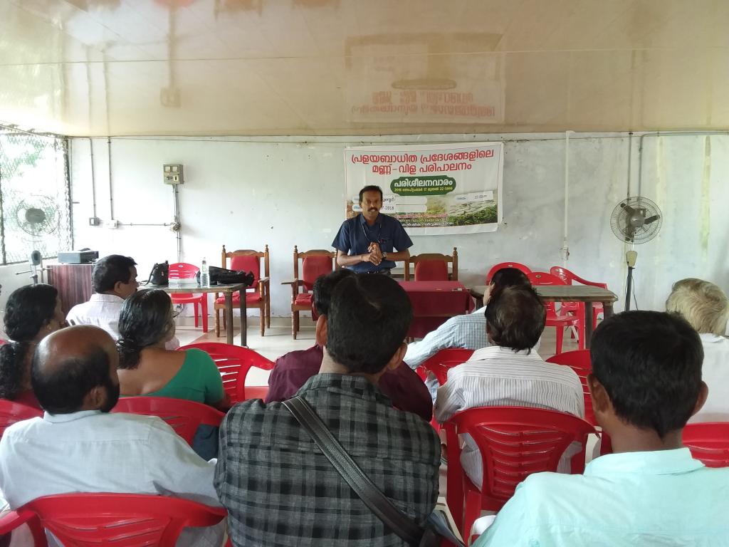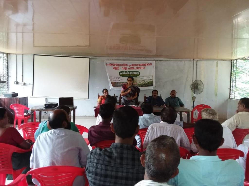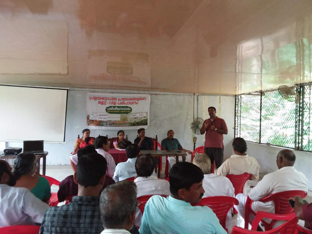 കേരള കാർഷിക സർവ്വകലാശാല വിഞ്ജാന വ്യാപന ഡിറക്ടറേറ്റിന്റെ ആഭിമുഖ്യത്തിൽ തൃശൂർ ജില്ലയിലെ പ്രളയ ബാധിത പ്രദേശങ്ങളിലെ മണ്ണ്-വിള - മൃഗ പരിശീലന വാരം തുടരുന്നു. ജില്ലയിലെ പ്രവർത്തനങ്ങൾ ഏകോപിപ്പിക്കുന്നത് തൃശൂർ കൃഷി വിഞ്ജാന കേന്ദ്രമാണ്.മൂന്നാം ദിനം പഴയന്നൂർ ബ്ലോക്കിലെ കർഷകർക്കായി നടത്തിയ സെമിനാര് പഴയന്നൂർ ബ്ലോക്ക് പഞ്ചായത്ത് സ്റ്റാന്റിംഗ് കമ്മിറ്റി ചെയർമാൻ ശ്രീ. കെ.കെ സത്യൻ അവർകൾ ഉത്ഘാടനം ചെ യ്തു. ഈ മേഖലയിൽ കാർഷിക വിദഗ്ധർ പ്രളയനാന്തരം നടത്തിയ നിരീക്ഷണങ്ങളിൽ നിന്നും ലഭ്യമായ വിവരങ്ങളെ അടിസ്ഥാനപ്പെടുത്തി വരാനിരിക്കുന്ന വരൾച്ചയെ മുൻകൂട്ടി കണ്ട് കുറഞ്ഞ ജല ഉപഭോഗം ഉള്ള കൃഷികളായ ചെറു ധാന്യങ്ങൾ, പയർ, എള്ള് , എന്നിവക്ക് മുൻഗണ നൽകണമെന്ന് നിർദ്ദേശിച്ചു . മൃഗ സംരക്ഷണ മേഖലയിൽ തീറ്റപ്പുൽ ക്ഷാമം പരിഹരിക്കുന്നതിനായി ബദൽ തീറ്റ സംവിധാനങ്ങളും നിർദേശിച്ചു. കാർഷിക മേഖലയിലെ നാശ നഷ്ടങ്ങളെക്കുറിച്ചു കർഷകർ വിശദീകരിച്ചു . പരിശീലനപരിപാടി കൃഷി വിജ്ഞാന കേന്ദ്രം മേധാവി ഡോ . എ . പ്രേമ , ഡോ. സൈന മോൾ കുരിയൻ , ഡോ. ബീന വി.ഐ , ഡോ. ഗിഗ്ഗിൻ, എന്നിവർ നയിച്ചു . സെമിനാറിൽ കൃഷി അസിസ്റ്റന്റ് ഡയറക്ടർ ജോസഫ് ജോൺ തേറാട്ടിൽ നന്ദി പ്രകാശിപ്പിച്ചു .